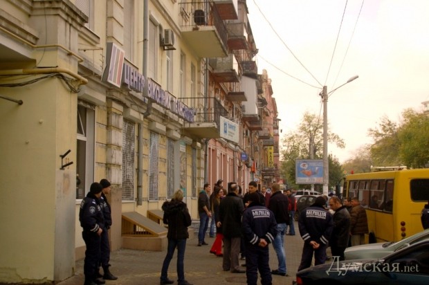 Спустя некоторое время на место конфликта прибыла милиция. Правоохранители опрашивают собравшихся. Вывеска пока остается на своем месте.