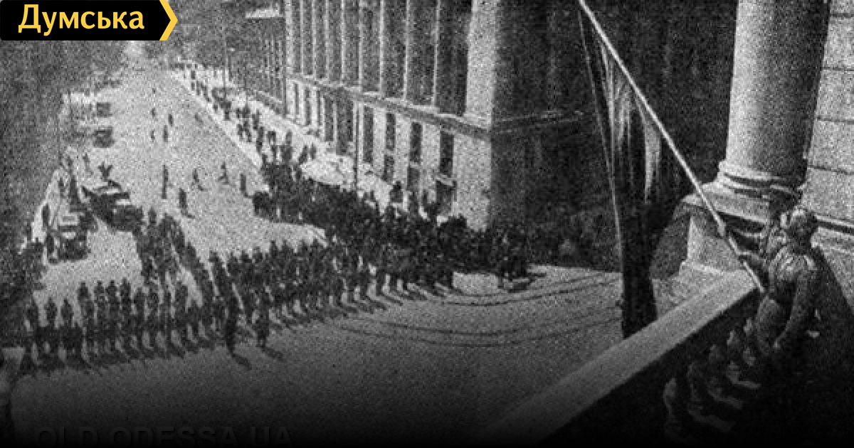 Так это здание (справа) выглядело сразу после освобождения Одессы. В августе 1944 года на него упали бомбы