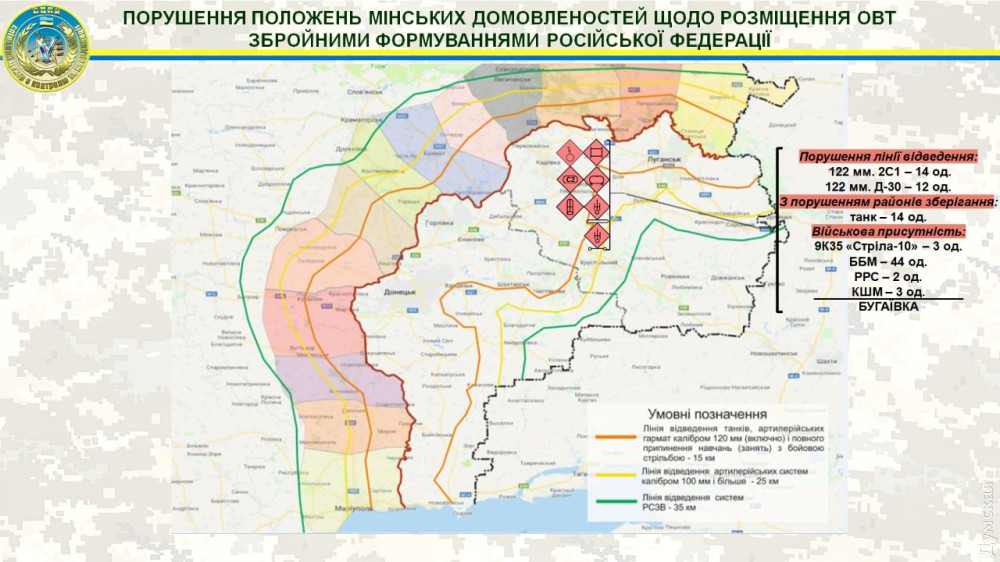 На оккупированных территориях Луганской области, которые контролируются «2 армейским корпусом» РФ, у Бугаевки (37 км от линии разграничения) зафиксированы 14 гаубиц 2С1 «Гвоздика», 12 122-мм гаубиц Д-30, один танк Т-72 и 13 танков Т-64.