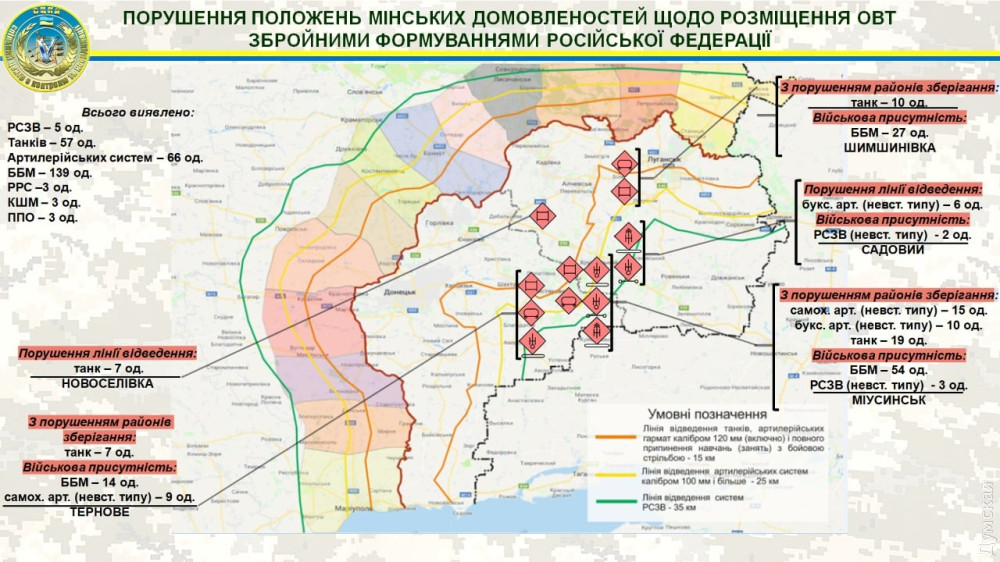 Так, на территории оккупированных районов Донецкой области, которые находятся под контролем «1 армейского корпуса» РФ, были зафиксированы нарушения правил отвода войск в районе Новоселовки (в 31 км от фронта стоят семь танков), в Терновом (в 57 км от фронта еще семь танков, девять САУ и 14 бронемашин).
