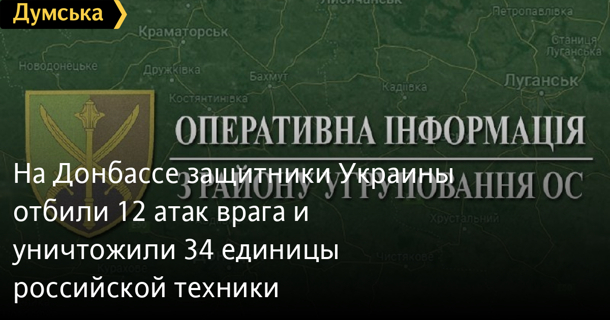 Украинские защитники на Донбассе за сутки отбили двенадцать атак врага и уничтожили 34 единицы российской техники. Еще на шести локациях продолжаются бои с оккупантом.