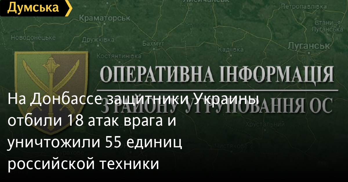 Защитники Украины на Донбассе за сутки отбили восемнадцать атак врага и уничтожили 55 единиц российской техники.