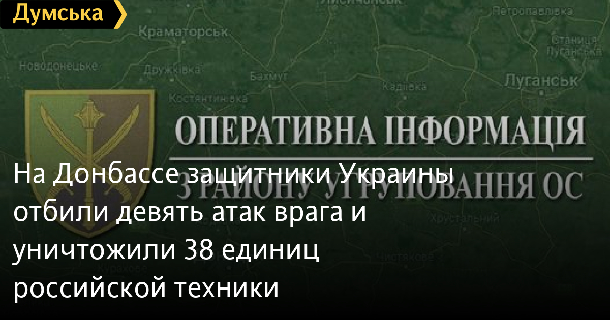 На Донбассе защитники Украины за сутки отразили девять атак врага и уничтожили 38 единиц российской техники.