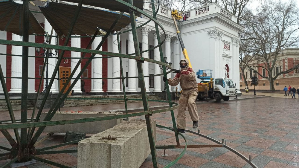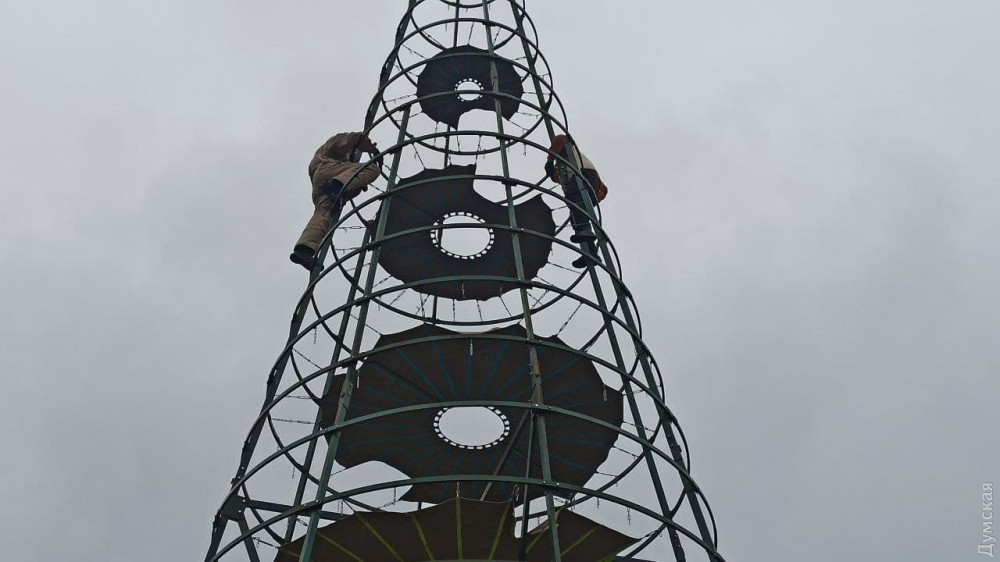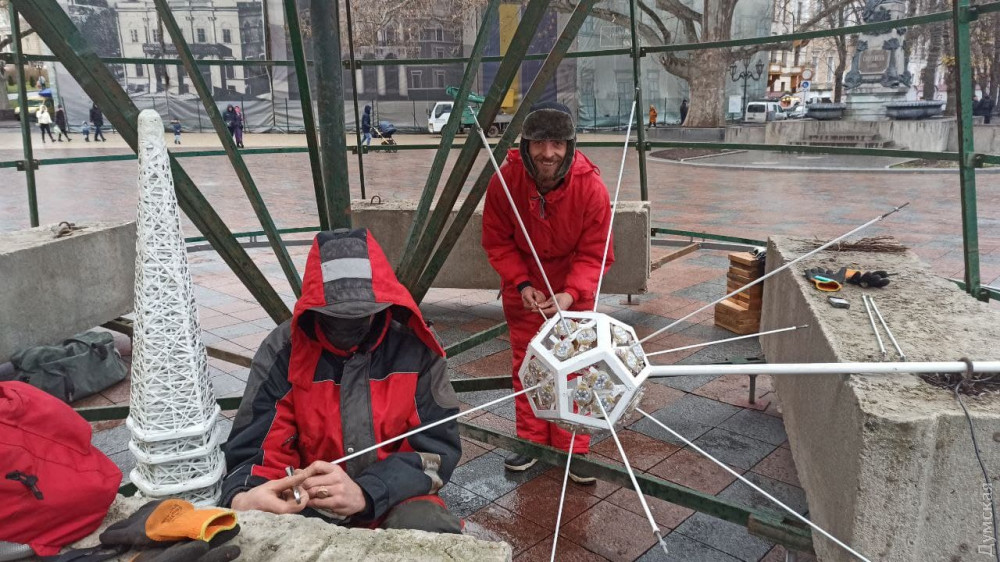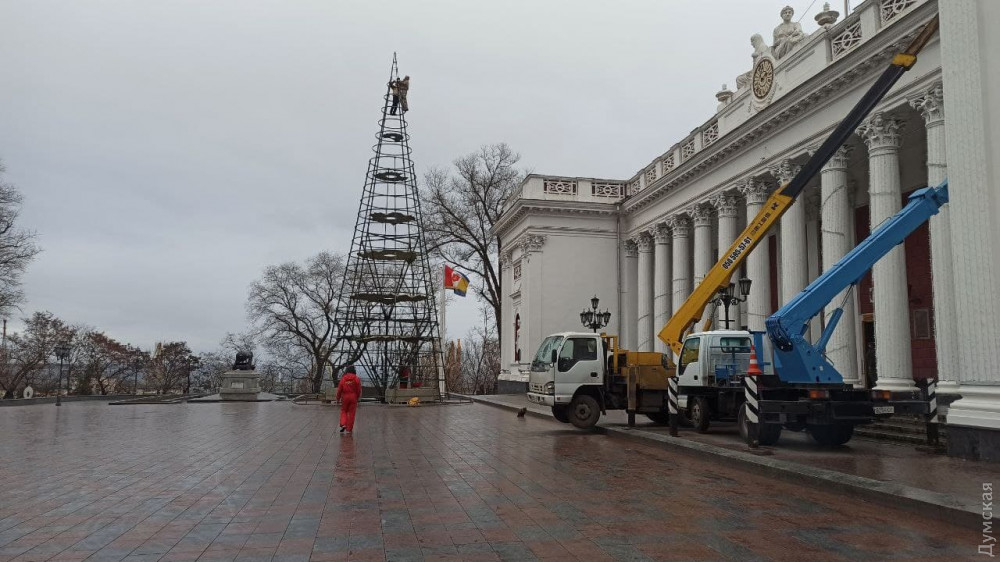 Корреспондент «Думской» прошелся по главной праздничной локации города и сообщает, что у мэрии уже начали собирать искусственную елку, а также монтировать гирлянды на колонны здания Старой биржи.