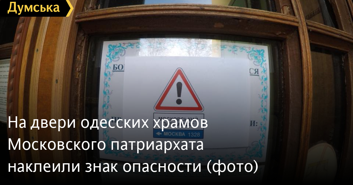 Группа одесских патриотов наклеила на двери православных храмов, относящихся к Московскому патриархату, наклейки с дорожным знаком 1.39 «Аварийно опасный участок» и расстоянием до столицы РФ (1328 км).
