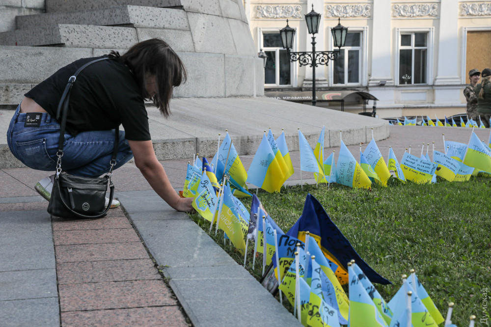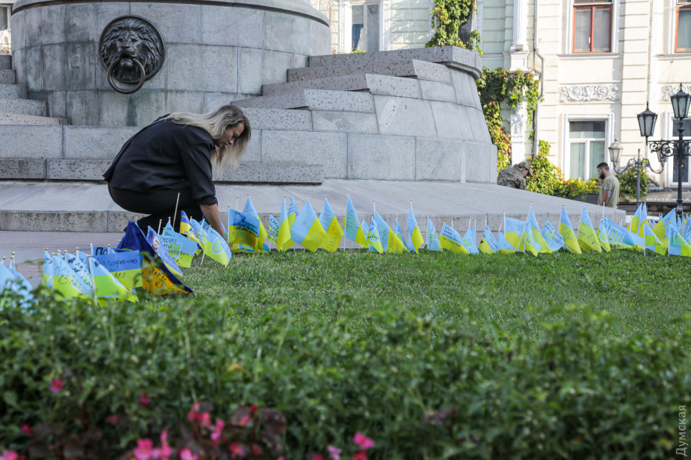 Як повідомляє кореспондент «Думської», газони навколо постаменту, на якому колись стояв пам'ятник російській імператриці Катерині II, перетворили на народний меморіал пам'яті про загиблих українських військовослужбовців. На честь кожного воїна родичі встановлюють жовто-блакитний прапорець із його ім'ям або позивним. Таких прапорців там уже десятки Подібні меморіали виникають і в інших містах України.