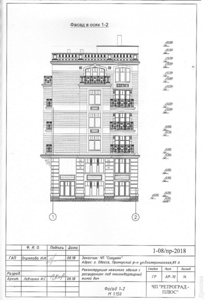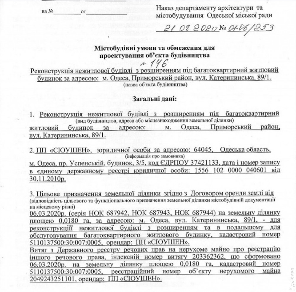 Официально работы назвали реконструкцией с расширением под многоквартирный жилой дом высотой от 18,6 до 21,3 м (это шесть-семь этажей). Договор аренды земли подписали с мэрией в марте этого года. Участок расположен в границах центрального исторического ареала Одессы.