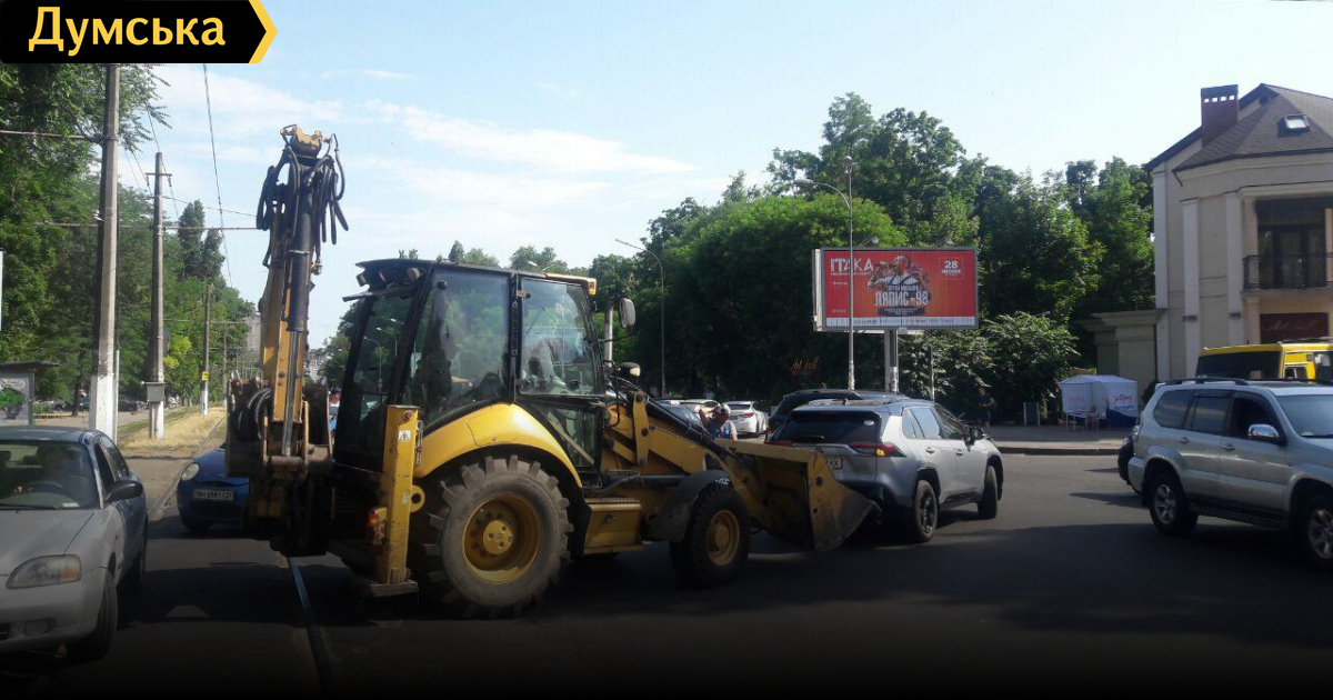 На одесском Фонтане экскаватор зацепил внедорожник: стоят трамваи, образовались пробки