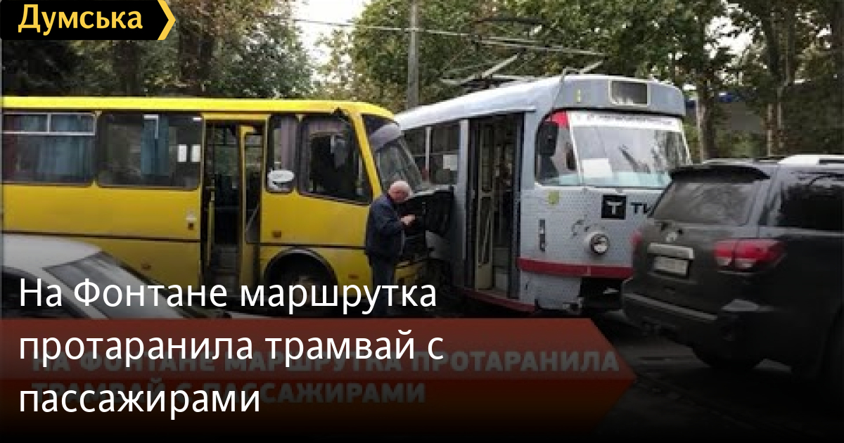 Трамвай и маршрутка не поделили дорогу в районе 4-й станции Большого Фонтана. Водитель маршрутного такси №208 не предоставил приоритет в движении трамвайному вагону №17 и врезался в него.