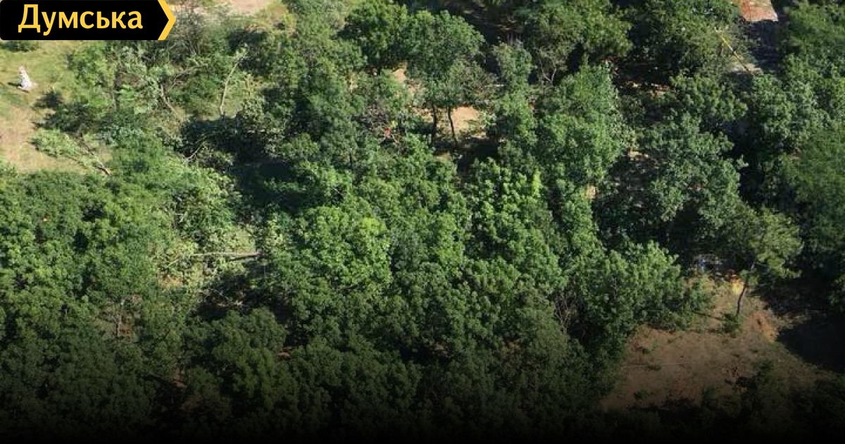 Как отметил активист Владислав Балинский, во второй половине дня 15-20 человек в балаклавах и с бензопилами в руках зашли на огороженную территорию сквера и за очень короткое время спилили деревья.