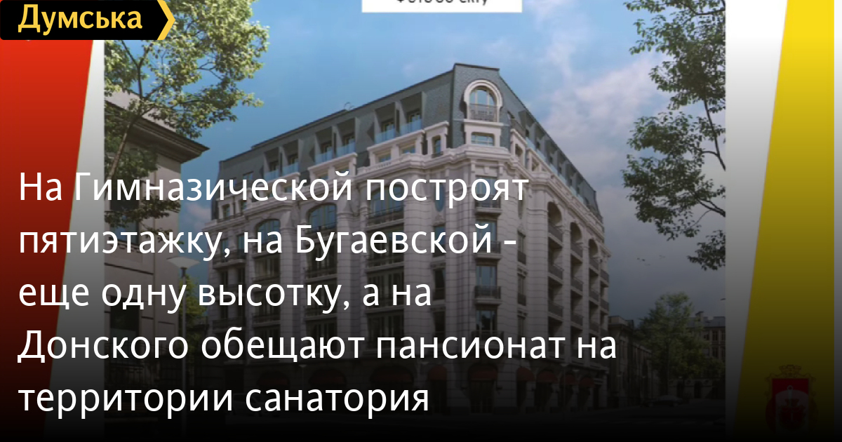 Кроме того, по словам депутата от ОПЗЖ Алексея Еремицы на Дмитрия Донского, на месте действующего санатория планируют построить четырехэтажный пансионат и попросил вывести визуализацию.