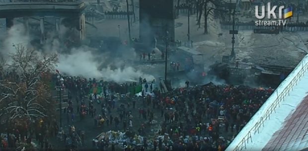 В настоящее время протестующие прекратили бросать булыжники в сторону силовиков, потушили покрышки, однако продолжают скандировать «Банду геть!».
