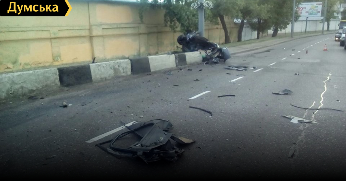 Ух, проезжал утром мимо. Его не буквально разорвало пополам, а таки разорвало — на фото только половина авто, вторая половина за кадром по пути движения лихача.