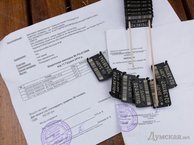 Предприниматель продемонстрировал специальный маркер на срубе, чипы и документы на свой товар. Стоимость сосен — от 50 грн за метровую красавицу.