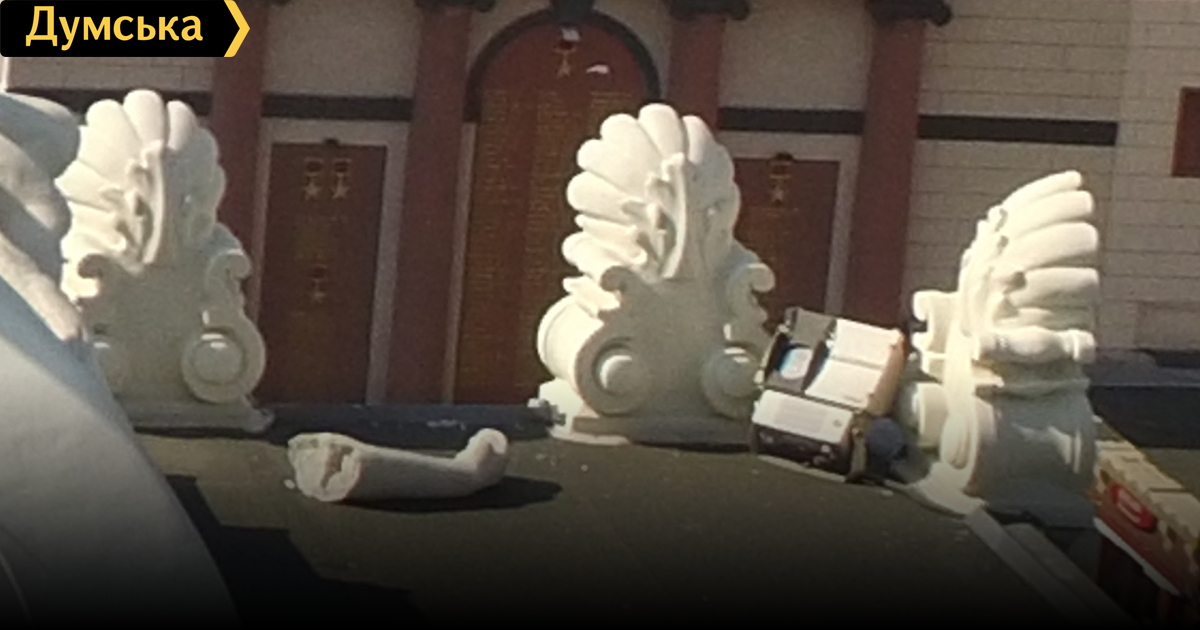 Пролетая с помощью дрона над Оперным театром в рамках проекта «ДумскаяView», наш корреспондент обнаружил, что одна из скульптур потеряла свою целостность.
