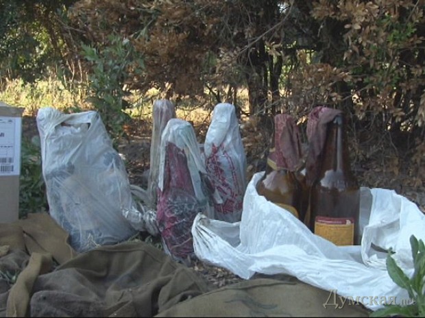 Каждая из них содержала по три наполненных какой-то жидкостью полулитровых бутылки. Жидкость имела характерный запах горюче-смазочных материалов. Кроме того, из каждой бутылки торчала тряпка, что навело правоохранителей на мысль о «коктейле Молотова».