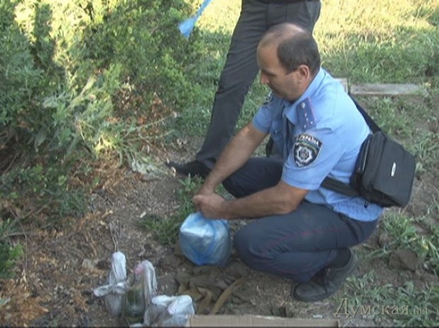 По информации пресс-службы облУВД, прибыв на место сотрудники следственно-оперативной группы Приморского райотдела, кинологи и специалисты-взрывотехники провели тщательный осмотр территории и нашли в земле коробку, в которой находились три сумки от противогазов.