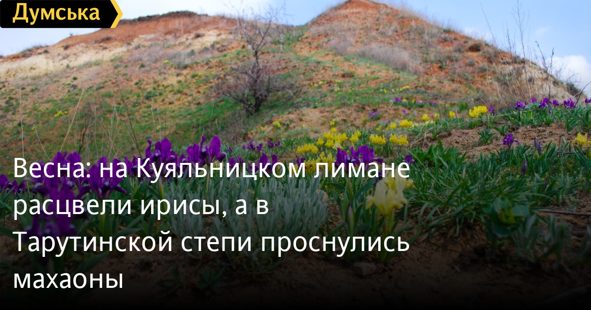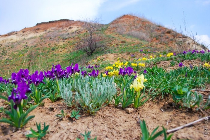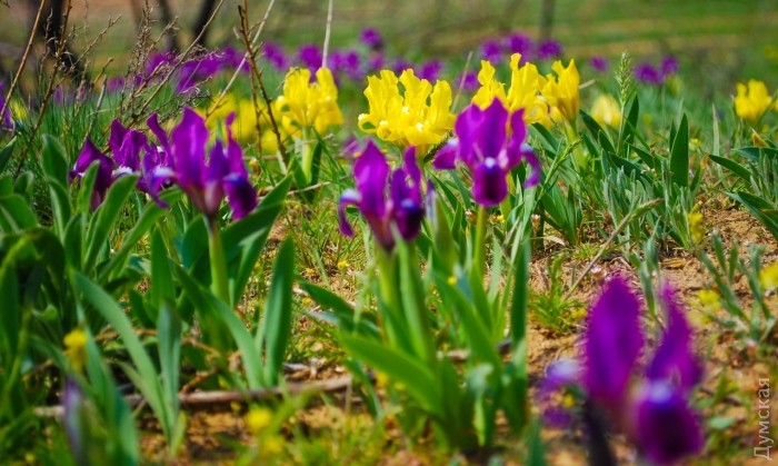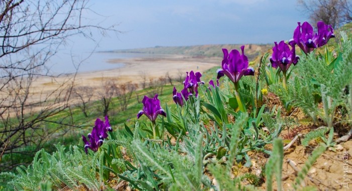 На берегах Куяльницкого лимана расцвели дикие ирисы — желтые и фиолетовые. Фото распустившихся цветов разместил в соцсетях одессит Михаил Морозов.