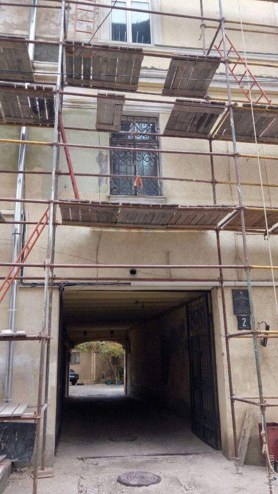 Ремонтные работы ведутся на фасаде дома №2 по Ланжероновскому спуску.