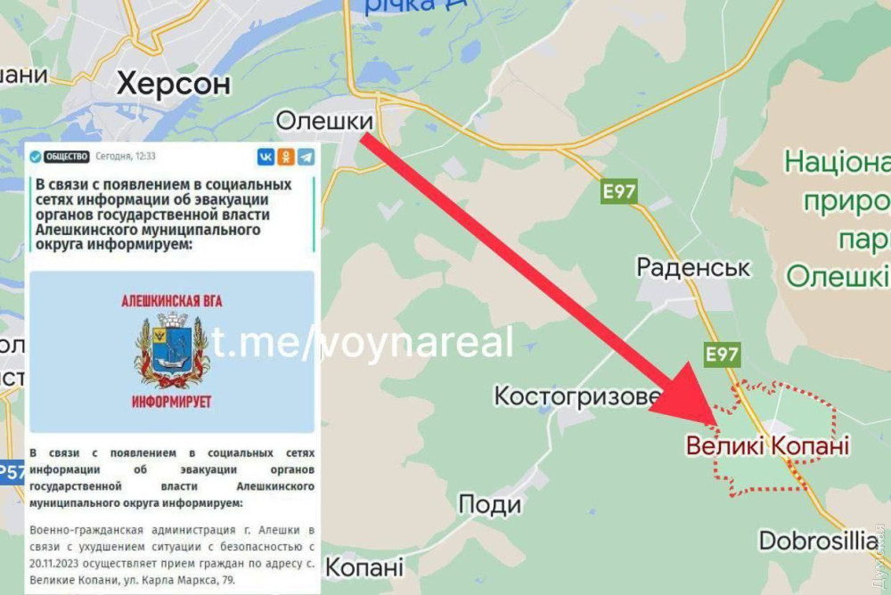 Так звана «Альошкінська військово-цивільна адміністрація», створена окупантами в місті Олешки на Лівобережжі в Херсонській області, 20 листопада евакуювалася до села Великі Копані, що за 30 кілометрів на схід.