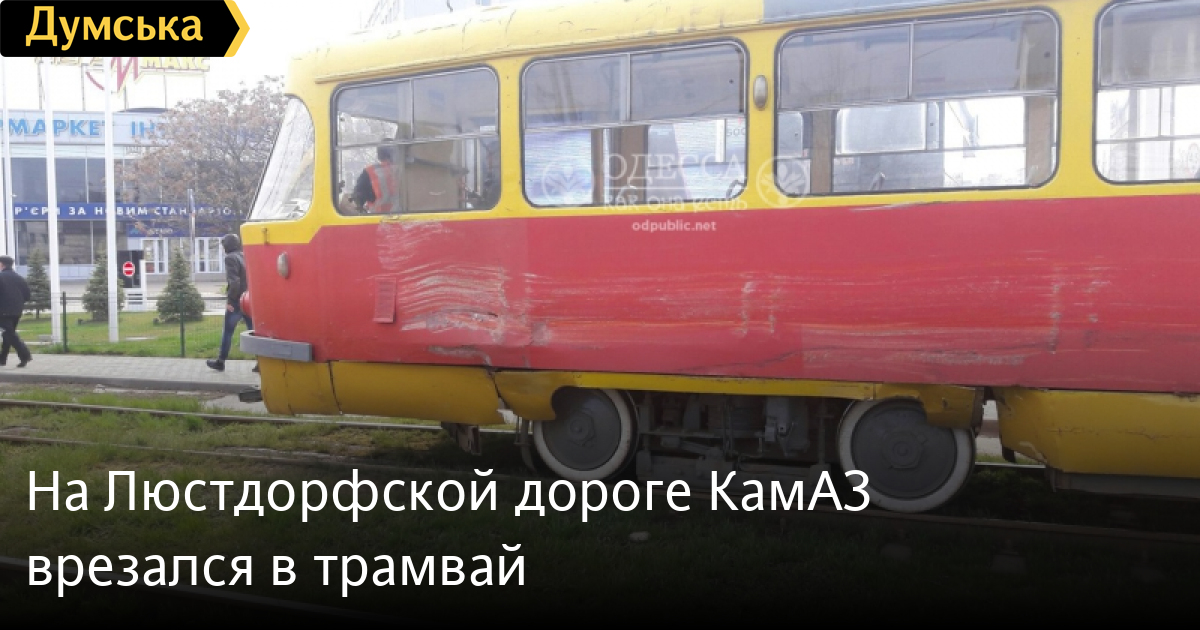 Сегодня в районе четвертой станции Люстдорфской дороги произошло ДТП с участием трамвая. Об этом сообщает пресс-служба КП «Одесгорэлектротранс». «Водитель автомобиля КамАЗ в нарушение ПДД не предоставил преимущественного права проезда и допустил столкновение с трамваем, следовавшим по маршруту №13», — говорится в сообщении. Пострадавших в результате аварии нет. Движение электротранспорта было заблокировано в течение 40 минут. Фото — «Одесский паблик»