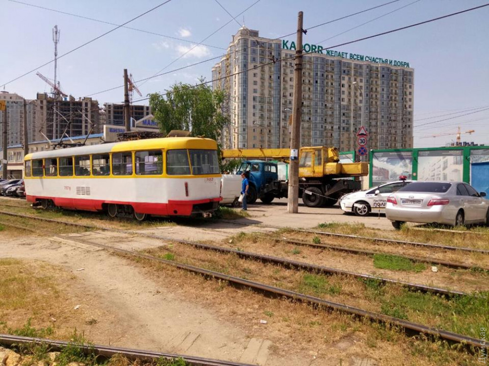 Движение трамвайных маршрутов №3 и 27 временно приостановлено. Отметим, что на этом прямом участке трамваи часто разгоняются до 60-70 км/ч, хотя здесь действует ограничение до 20 км/ч.