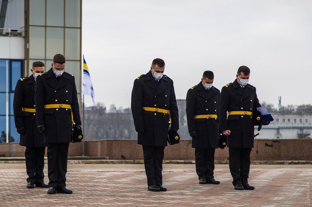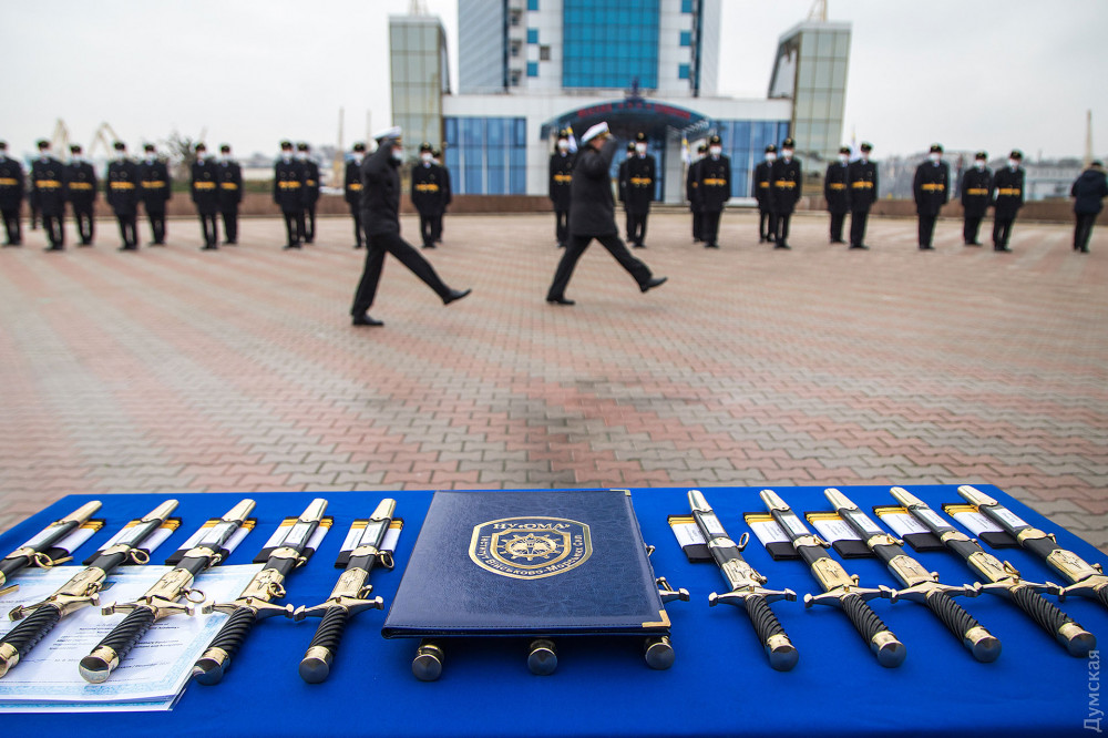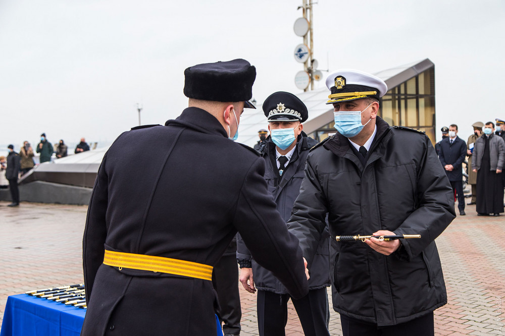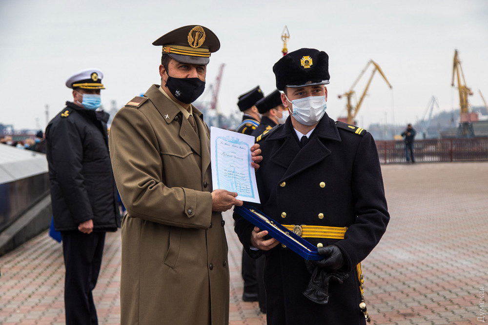 Дипломы с отличием получили двое выпускников института — Антон Мельник и Михаил Печенюк. Последнего отметили также также кортиком ВМС Италии, который традиционно достается лучшим курсантам одесского института. Его вручил помощник атташе по вопросам обороны при посольстве Италии в Украине Массио Проетти.