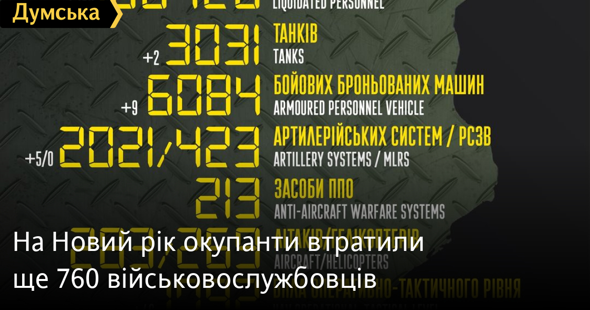 Сили оборони України 31 грудня скоротили кількість рашистів на 760 солдатів і офіцерів. Загальні втрати ворога з 24 лютого становлять уже 106 720 військовослужбовців. У Геншатбі Збройних сил України повідомили, що вчора також було знищено два ворожі танки (3031 за весь час), дев'ять бронемашин (6084), п'ять артилерійських систем (2021), 13 вантажівок (4720) та одну одиницю спецтехніки (181). Було збито 12 крилатих ракет (723) і 46 дронів оперативно-тактичного рівня (1792). СМЕРТЬ РОСІЙСЬКИМ ОКУПАНТАМ! Помітили помилку? Виділяйте слова з помилкою та натискайте control-enter |