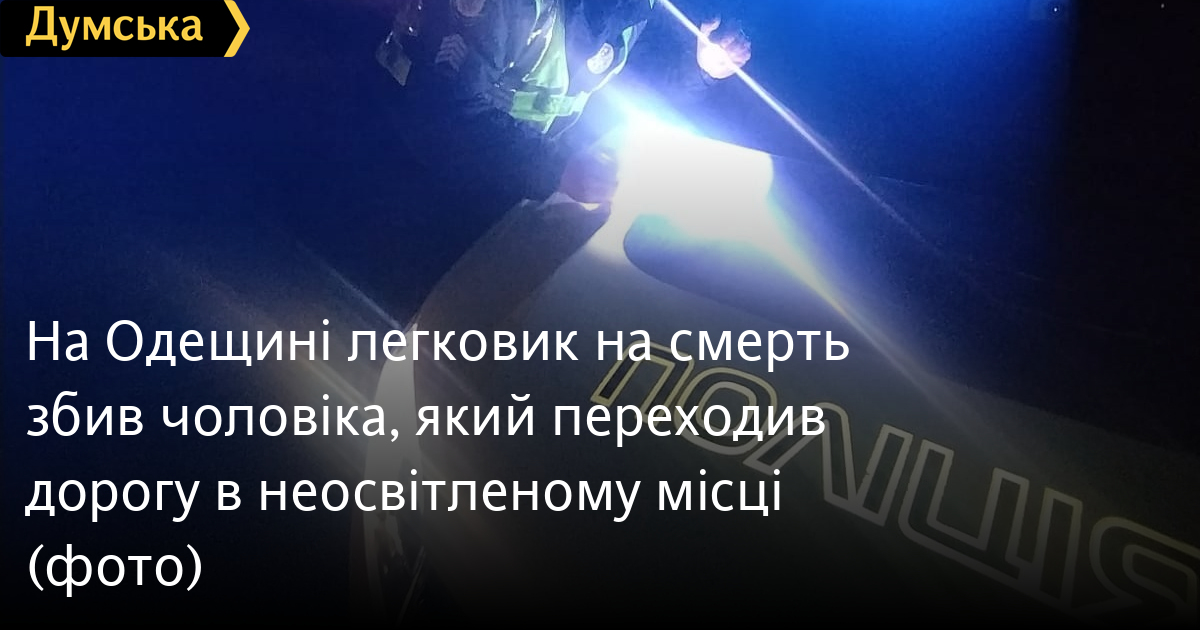 На Одещині легковик на смерть збив чоловіка, який переходив дорогу в неосвітленому місці44-річний водій Toyota Avensis збив чоловіка, який переходив дорогу в неосвітленому місці. Від отриманих травм потерпілий помер до приїзду швидкої, повідомили в поліції регіону. Подія сталася 13 лютого близько 19:00 на вулиці Кишинівська у селі Випасне. Правоохоронці встановлюють особу загиблого та повні обставини дорожньо-транспортної пригоди. Водія, жителя Білгорода-Дністровського, перевірили на стан алкогольного сп’яніння – він був тверезий. Вирішується питання щодо внесення відомостей до Єдиного реєстру досудових розслідувань за частиною 2 статті 286 (порушення правил безпеки дорожнього руху або експлуатації транспорту особами, які керують транспортними засобами, що спричинили смерть потерпілого) Кримінального кодексу України. СМЕРТЬ РОСІЙСЬКИМ ОКУПАНТАМ! Помітили помилку? Виділяйте слова з помилкою та натискайте control-enter Новини по цій темі: 29 липня 2025: В Усатово Одеської області сталася перестрілка: поліція працює на місці (відео, оновлено) 28 липня 2025: П'яний на "Ягуарі" або гіпертонік? Звільнений топ-посадовець одеської поліції хоче повернутися на службу 19 червня 2025: Дівчинку, яку шукали сотні одеситів, знайшли вбитою: поліція працює з чоловіком, ймовірно причетним до загибелі 27 травня 2025: Увели гектар в університету: на Одещині засудили земельних аферистів, але без посадки і Хвоста |