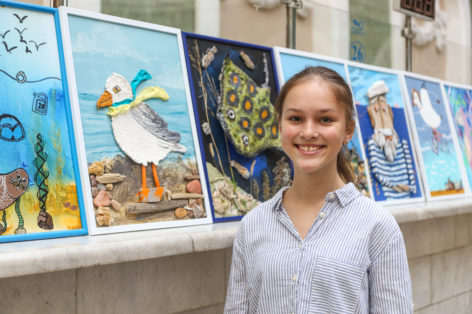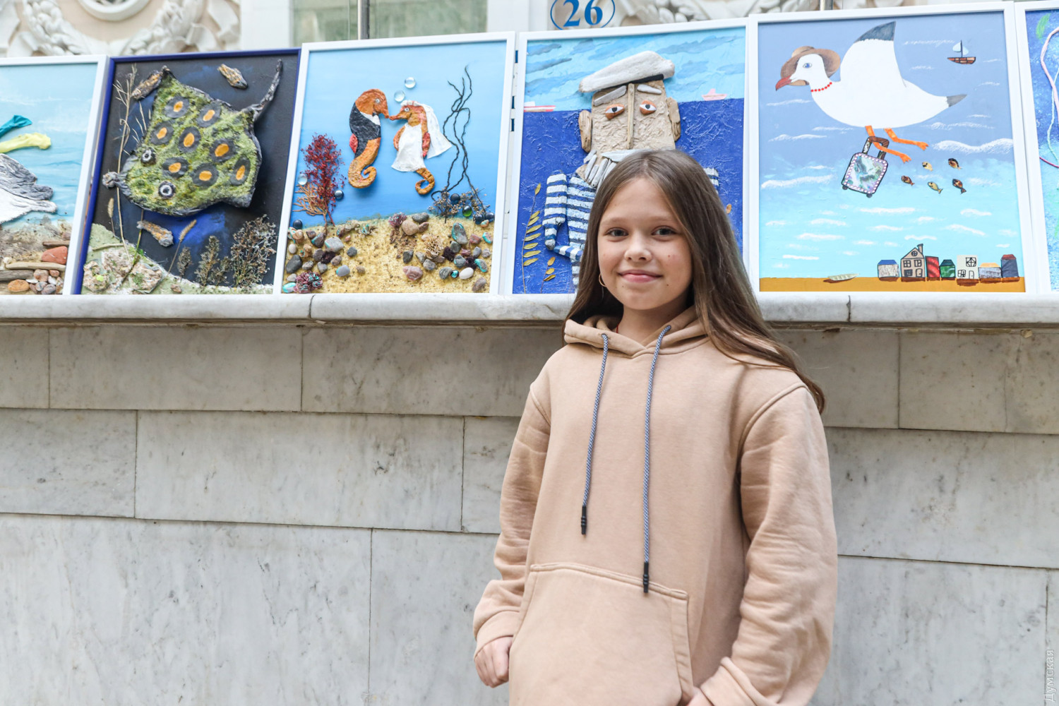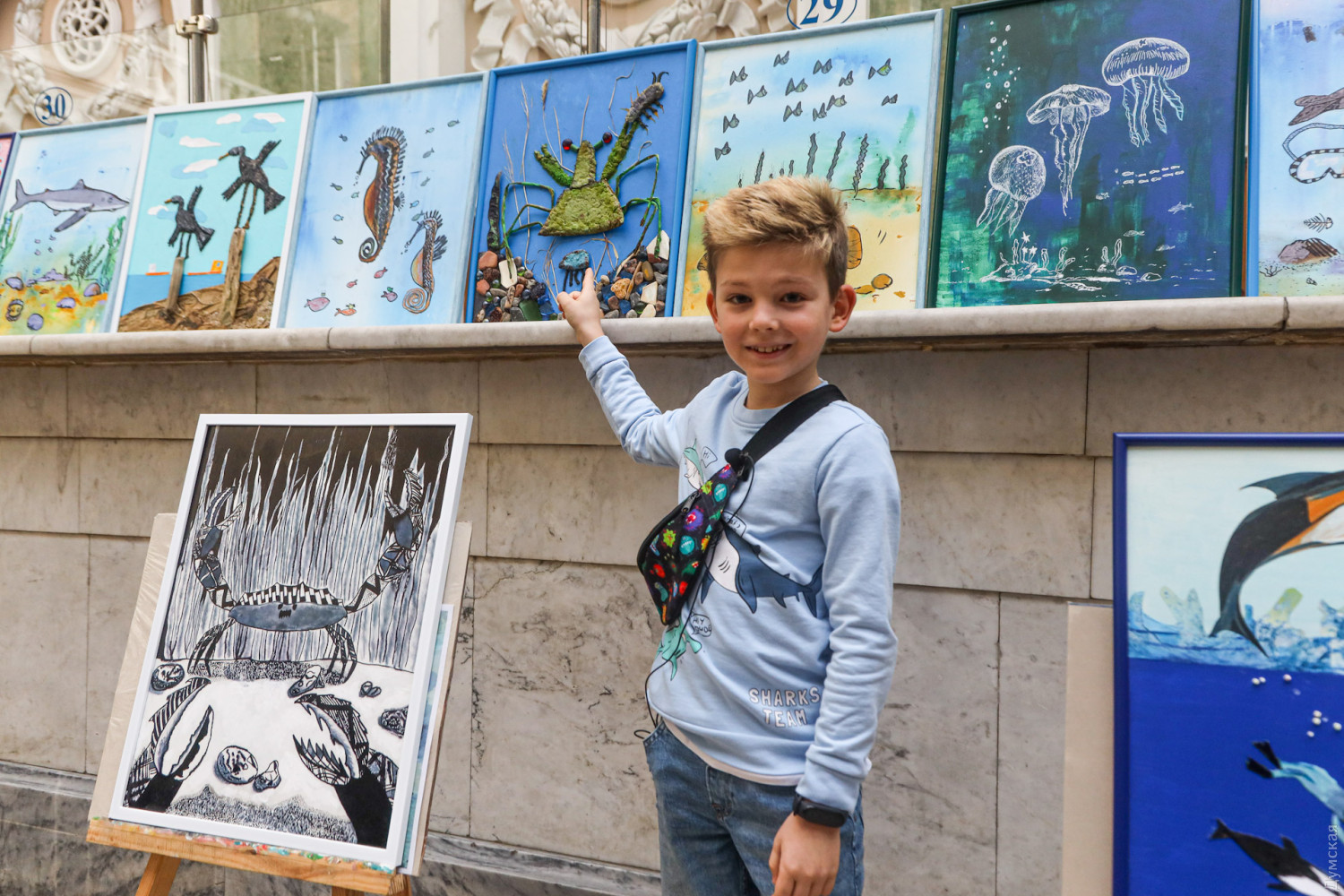 «Це краб-невидимка, — розповів нам підростаючий художник. — Я малював його чотири тижні, а потім ще десь тиждень збирав на морі камінчики і клеїв на картину. В Одесі мені дуже подобається».