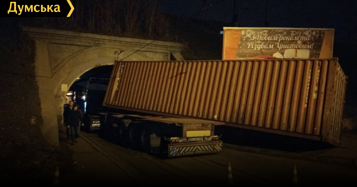 Водитель грузовика не рассчитал габариты контейнера, который перевозил, и не вписался в проем Глухого моста. Как сообщают очевидцы, ДТП произошло вечером 29 декабря. Груз не поместился в арку и завалился на бок. Пострадавших нет. Фото — Роман Козловский
