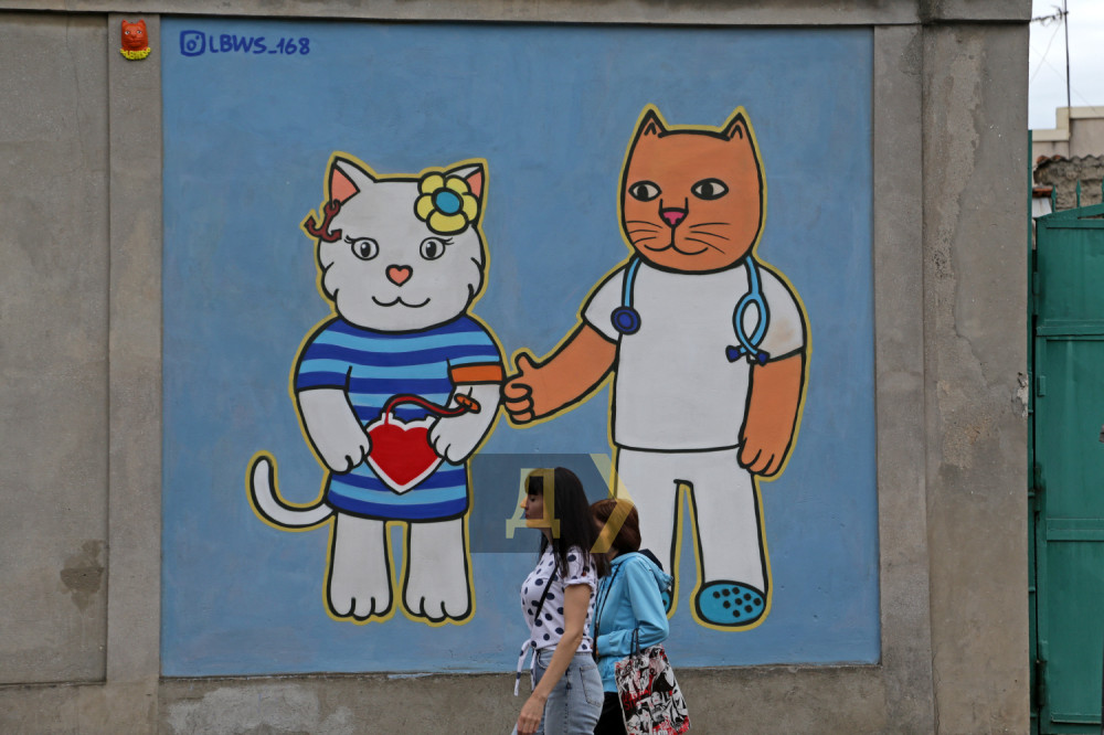 Огромное изображение на стене размером три на три метра можно увидеть напротив детской поликлиники №1, расположенной на улице Праведников Мира, 36 (бывшей Краснослободской). Один из котиков изображен донором, второй — благодарный врач.
