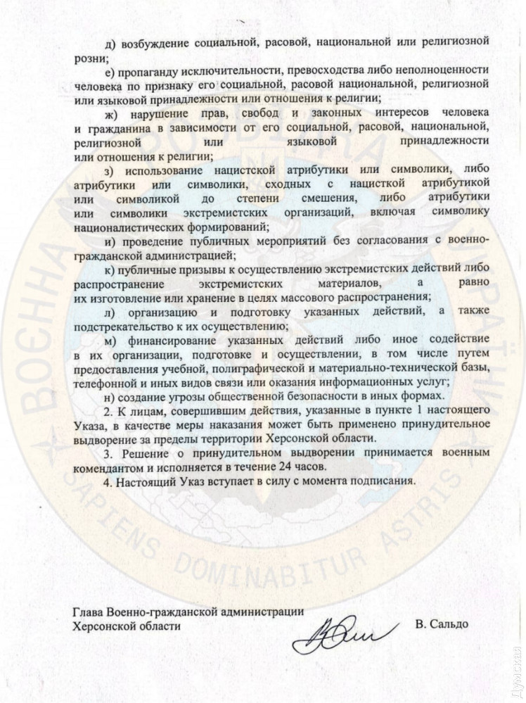 В наказі голови окупаційної влади Володимира Сальдо йдеться про заборону будь-якої діяльності, яка перешкоджає роботі органів влади, створених росіянами, повідомляють у Головному управлінні розвідки Міноборони України.