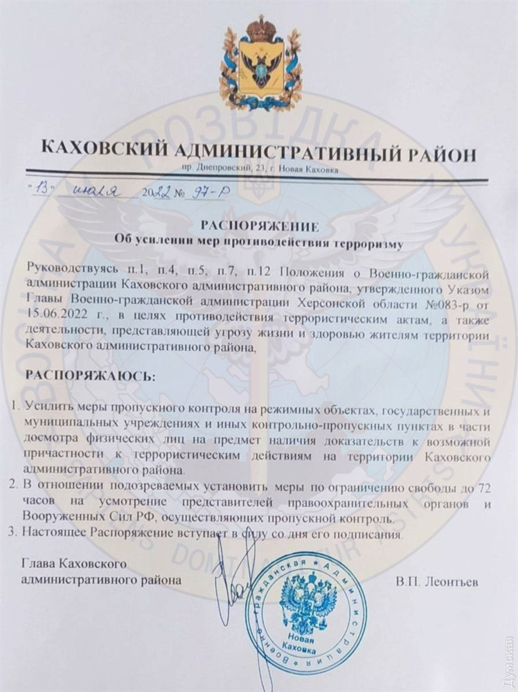 Розпорядженням «голови Каховської вца» Володимира Лєонтьєва в районі посилюють пропускний контроль. Відтепер дозволені обшуки, затримання та обмеження волі, які можуть проводитись на розсуд окупантів.