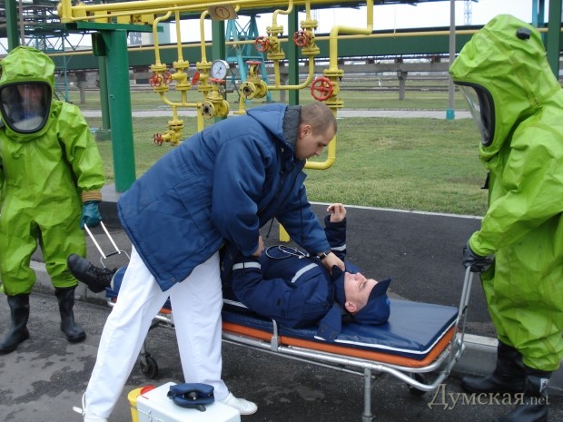 Задания спасатели выполняли в средствах защиты органов дыхания и зрения, а также в костюмах химзащиты. Силами скорой помощи Одесского припортового завода была оказана первая медицинская помощь пострадавшим.