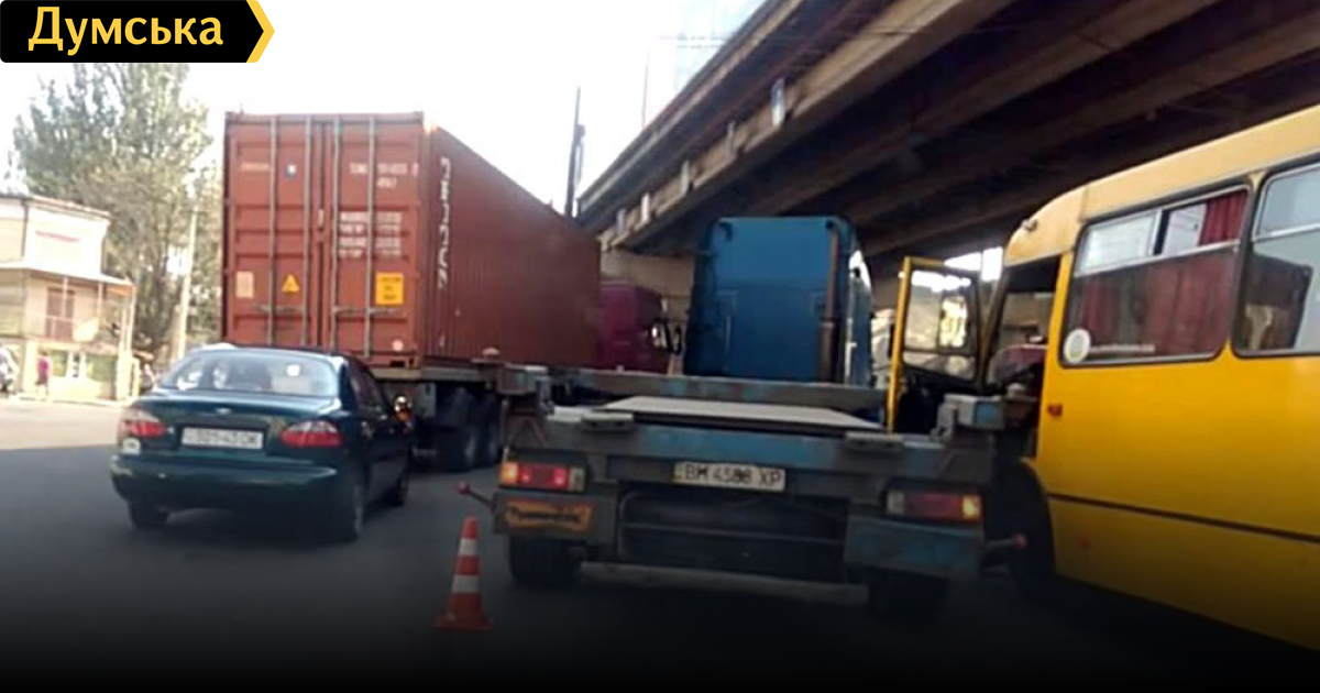 Авария у Пересыпского моста: фура зацепила маршрутку и оторвала бампер