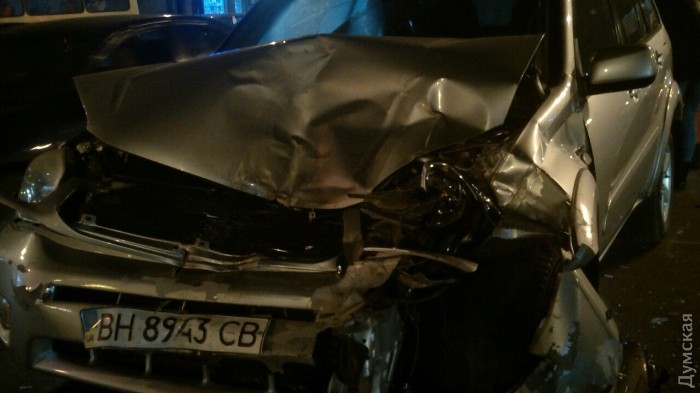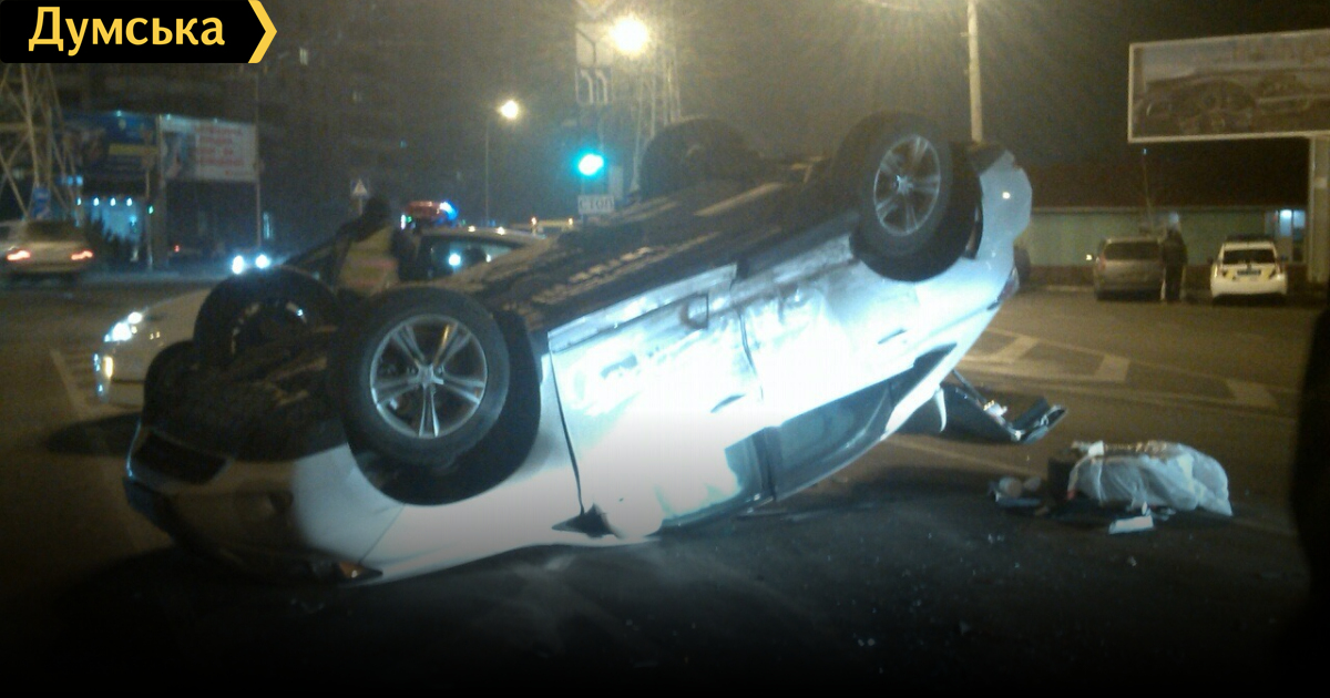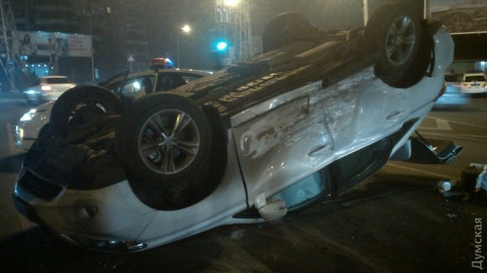 Как сообщают очевидцы, в результате аварии повреждены четыре автомобиля. Один из них - Lexus, от удара перевернулся на крышу. Чудом никто не пострадал.