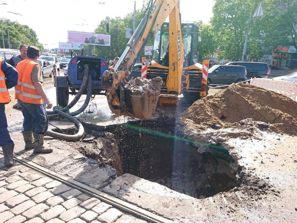 На месте прорыва рабочие проводят раскопки, чтобы установить характер и масштаб аварии.
