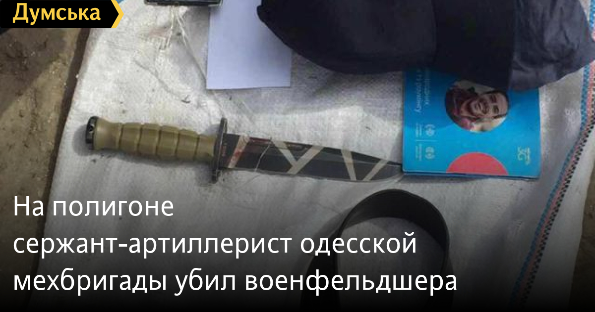 Трагедия произошла в ночь на 18 апреля в палатке полевого лагеря бригады. 27-летний главный сержант батареи отмечал свою помолвку в компании двух женщин-военнослужащих — психолога (своей невесты) и фельдшера. Между ними вспыхнула ссора, и сержант дважды ударил фельдшера ножом в сердце, а потом перерезал ей горло. Погибшей было 30 лет, она жительница Херсонской области.