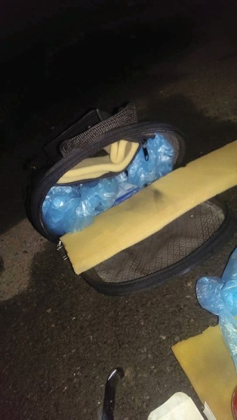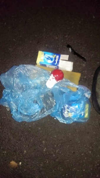 «В рюкзаке были обнаружены пять подозрительных предметов — лампочки, заполненные какой-то смесью красного цвета(предположительно взрывчатого жидкого вещества, собственно, сам задержанный первоначально утверждал, что может взорваться), залитых аккуратно алебастром, упакованных в заводские коробки и сложенные в рюкзак с жестким корпусом, между каждой коробкой был проложен слой поролона. Также был изъят туристический нож и плотные резиновые перчатки», — добавил активист.