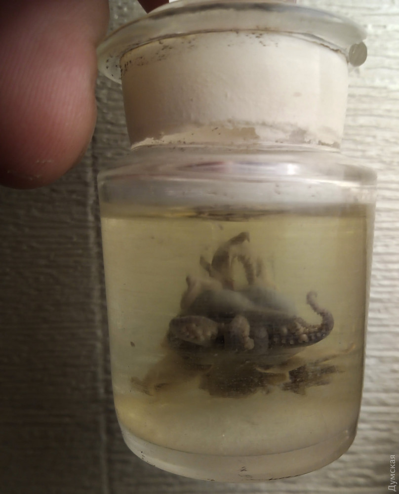 Как сообщил соорганизатор экспедиции, заведующий кафедрой истории Украины Южноукраинского педуниверситета Андрей Красножон, осьминог обнаружился в развале аптечных флаконов второй половины 1930-х – начала 1940-х годов.