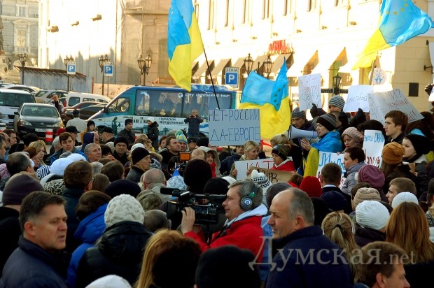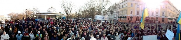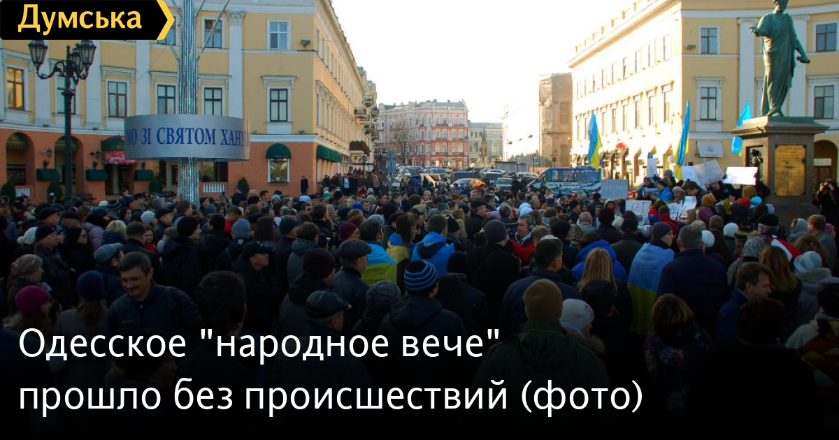 Сегодняшнее «народное вече» на Приморском бульваре стало самым массовым собранием за все время «евромайданных» протестов в Одессе. Несмотря на то, что наиболее активные участники акции еще в пятницу отправились в Киев, сегодня возле Дюка собралось порядка четырехсот человек.