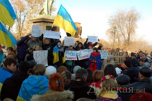 Они выразили свой протест против применения силы к участникам мирной акции на площади Независимости в Киеве. Также протестующие потребовали отставки руководства страны и наказания всех, кто принимал участие в разгоне митинга.