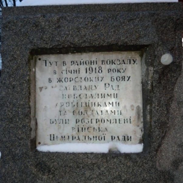 Решение о демонтаже камня с надписью «Тут, в районі вокзалу, у січні 1918 року в жорстоких боях за Владу Рад повсталими робітниками та солдатами були розгромлені війська Центральної Ради» городская историко-топонимическая комиссия в рамках декоммунизации приняла еще в мае 2016 года, однако реализовано оно было только на минувших выходных.