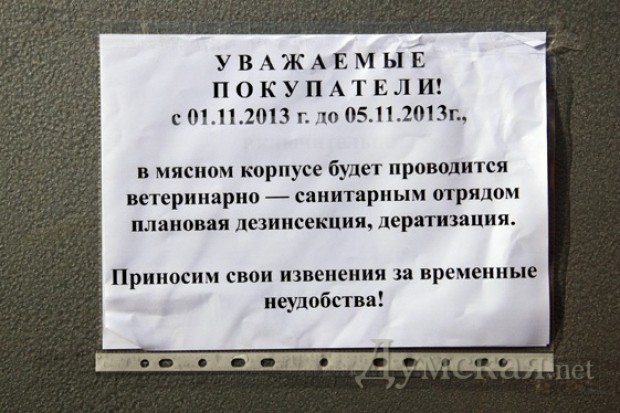 С сегодняшнего дня закрыт Мясной корпус на одесском рынке «Привоз». Как передает корреспондент «Думской», на закрытых дверях висит объявление о том, что в корпусе проводятся «санитарные мероприятия», которые продлятся до 5 ноября. То же самое говорят и в администрации рынка.