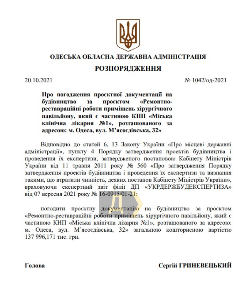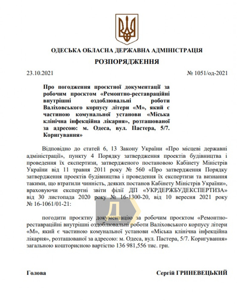 Соответствующую проектную документацию согласовал в октябре глава облгосадминистрации Сергей Гриневецкий: ОГА, по закону, согласовывает строительные проекты стоимостью от 120 до 400 млн грн, если они полностью или частично финансируются из местных бюджетов.