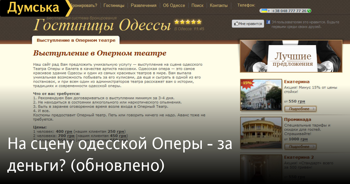 «Наш сайт рад Вам предложить уникальную услугу — выступление на сцене одесского Театра Оперы и Балета в качестве артиста массовки. Одесская опера — это самое красивое здание Одессы и один из самых красивых театров в мире. Вам выпала уникальная возможность побывать за его кулисами, да еще и сыграть в одной из его постановок, и при всем один из администраторов театра расскажет вам об истории, традициях и современности одесской оперы.