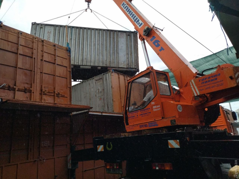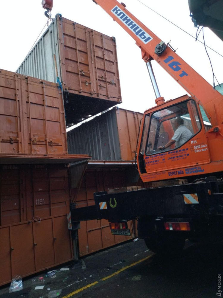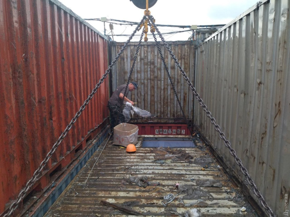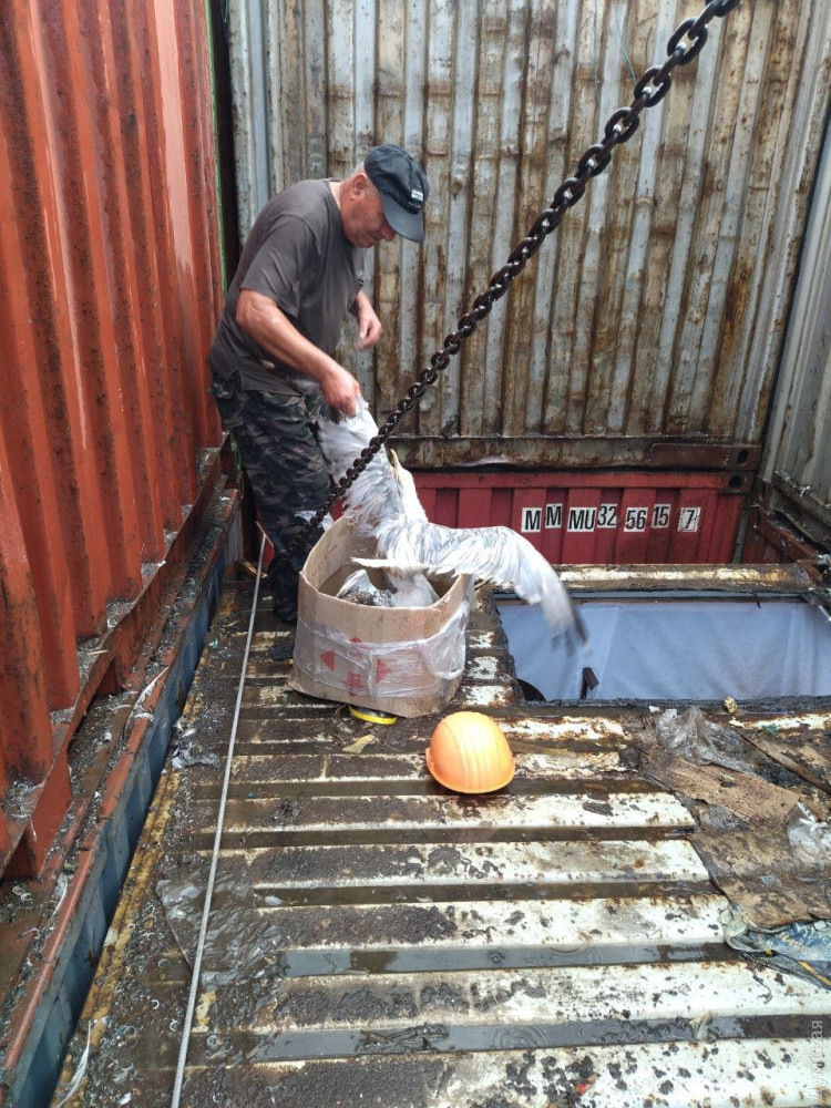 Щоб дістати чайок, довелося підняти краном верхній контейнер і посунути нижній. Операція тривала понад дві години під зливою.