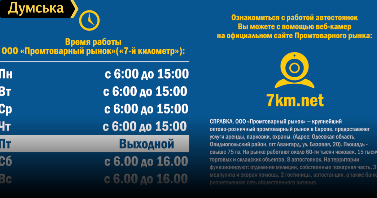На территории рынка функционируют: отделение милиции, собственные пожарная часть, 3 медпункта и скорая помощь, 2 гостиницы и автостанция, а также банк, разветвленная сеть общественного питания. Ежедневно промтоварный рынок «Седьмой километр» посещают около 200 тысяч человек. Адрес: Одесская область, Овидиопольский район, пгт Авангард, ул. Базовая, 20. Время работы: с понедельника по четверг — с 6.00 до 15.00, суббота и воскресенье — с 6.00 до 16.00. Пятница — выходной.