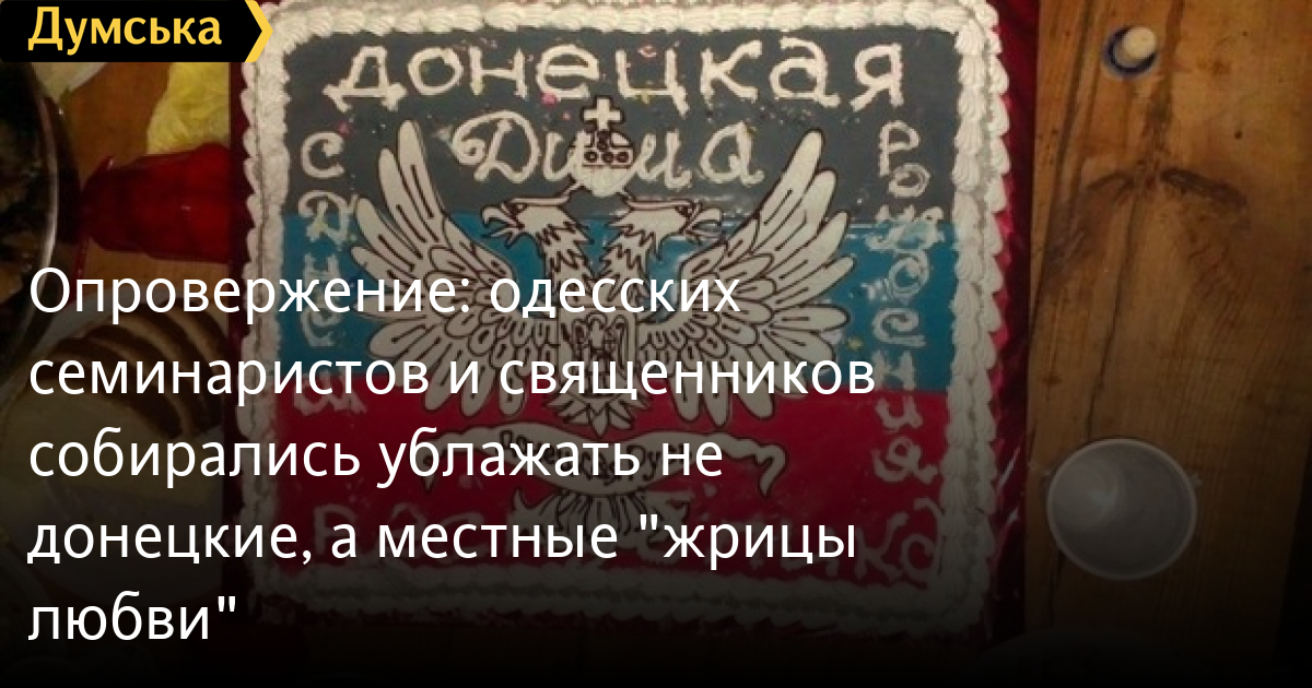 Как уже сообщала «Думская», для праздника, на котором присутствовали священнослужители и учащиеся одесской духовной семинарии, был приготовлен торт с символикой террористической организации «ДНР». Развлекать гостей вечеринки, которая проходила в сауне, должны были «девушки легкого поведения».